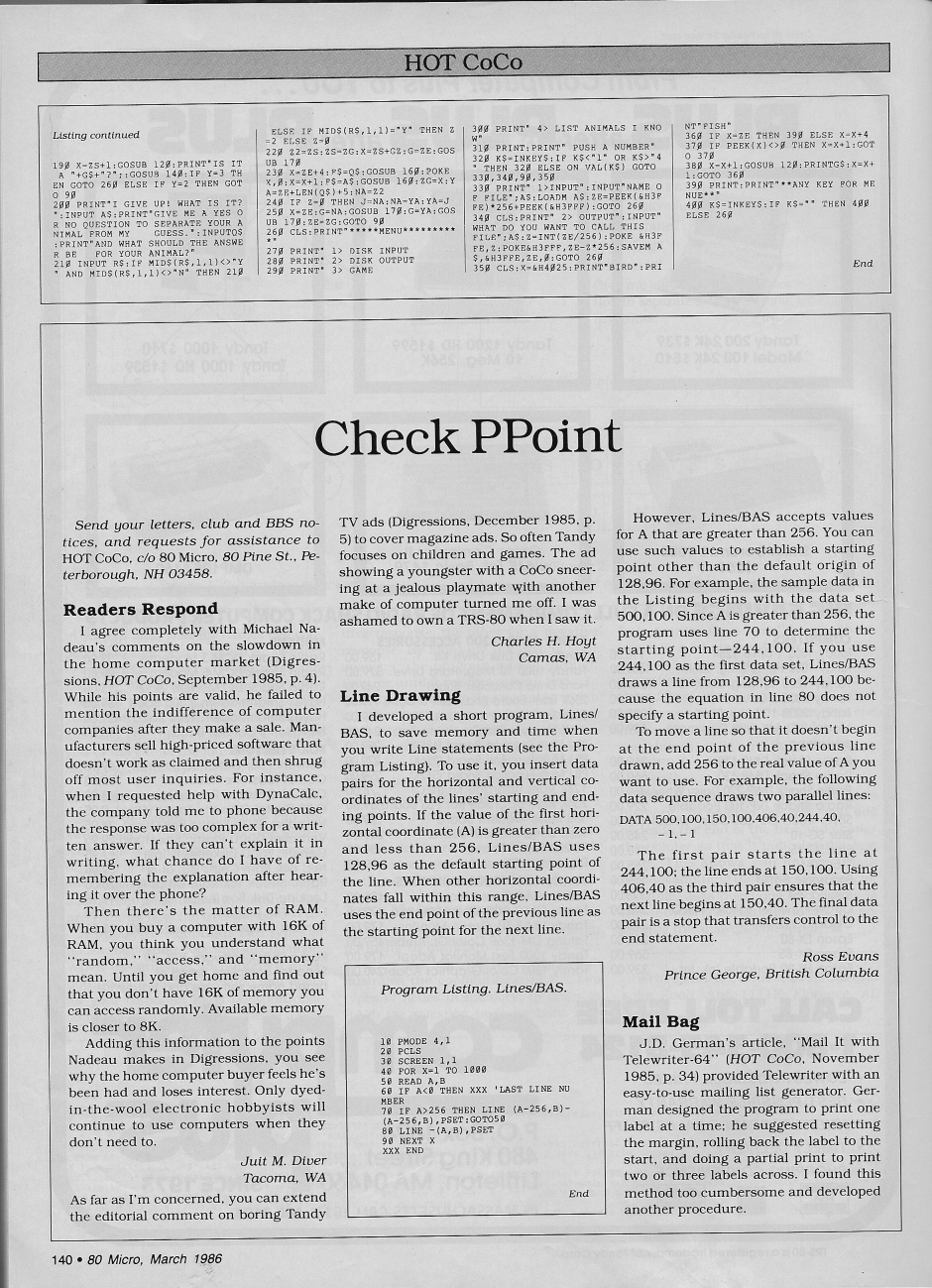 In March of 1986 80 Micro published my article/code "Animal House". I was a senior in high school. I got paid $125 for the work. Nearly all of the article text was heavily edited -- practically rewritten.