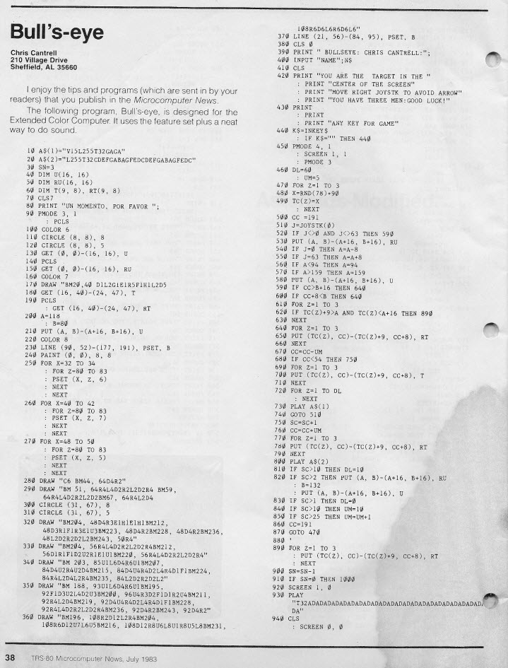 My first publication was the "Bull's Eye" game. It appeared in the July 1983 issue of TRS-80 Microcomputer News.